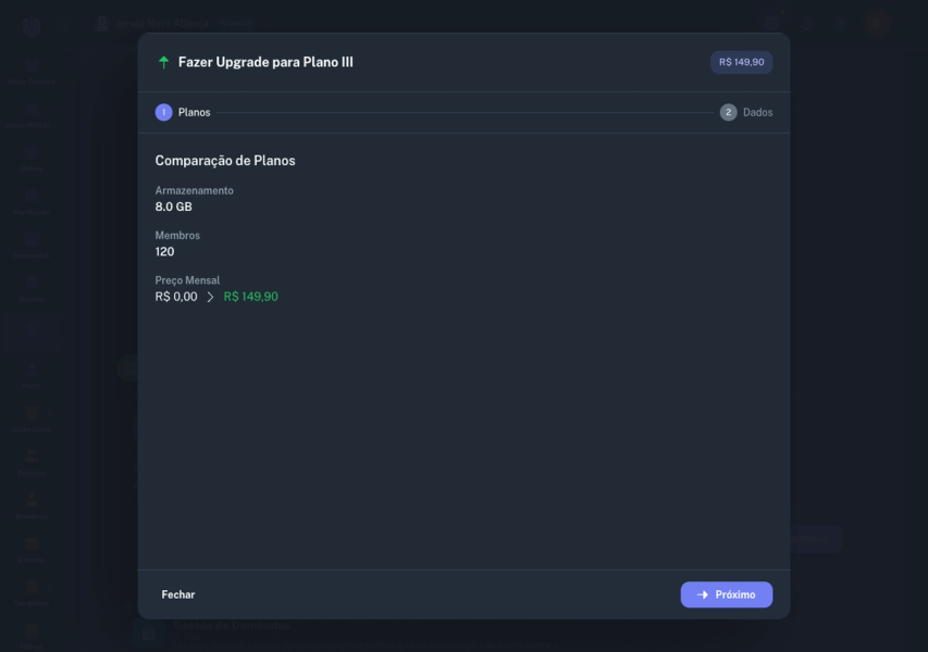 Localize o card do Plano III e clique em Fazer Upgrade. Um diálogo será aberto com os detalhes da mudança de plano.